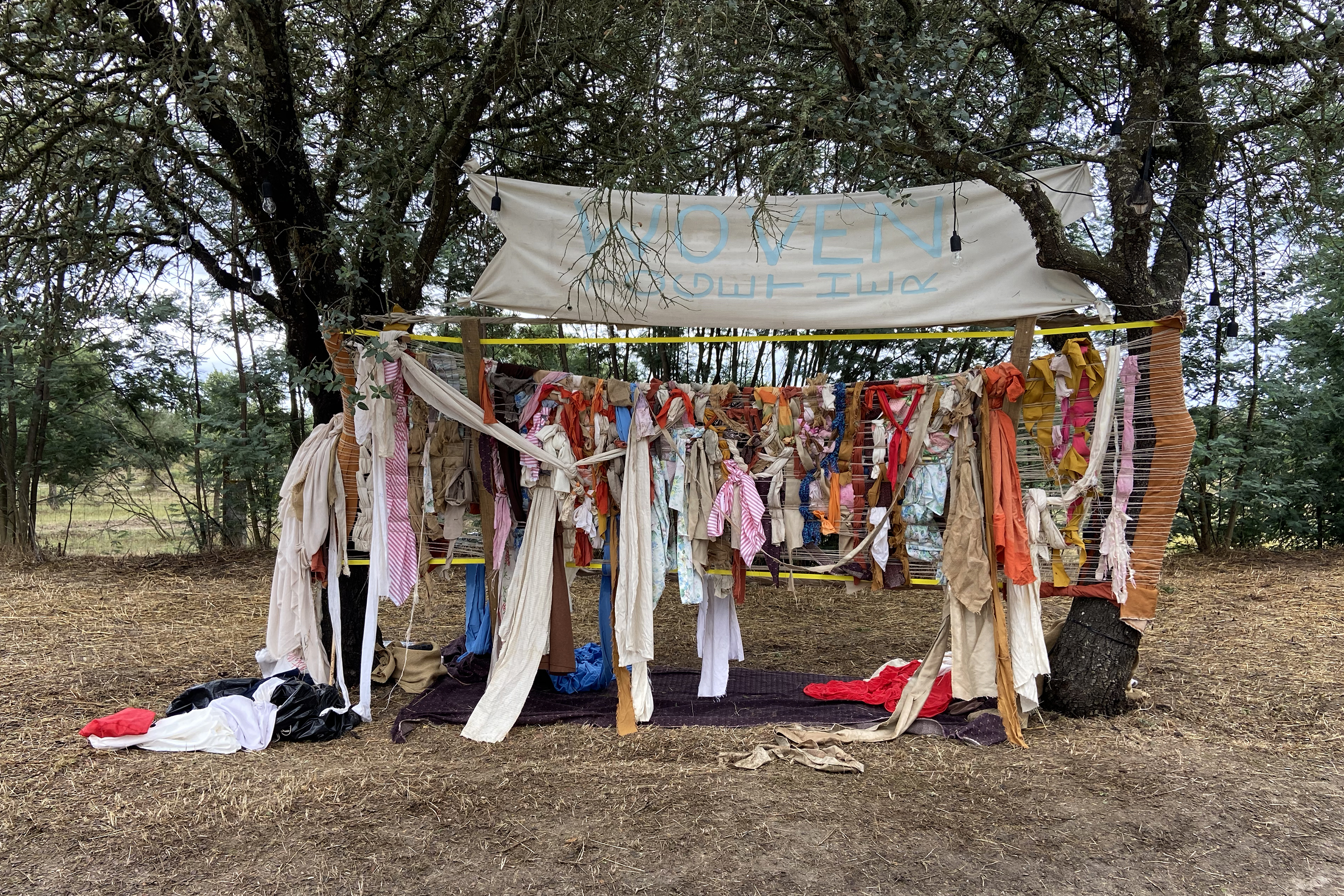 Created at the Waking Life Festival, Portugal, this participatory textile installation invited visitors to weave a communal textile from a decade of leftover fabrics. The process became a shared ritual, generating connection, reflection, and memory. A fragment of the large installation now functions as a lasting trace of this collaborative and ephemeral experience.